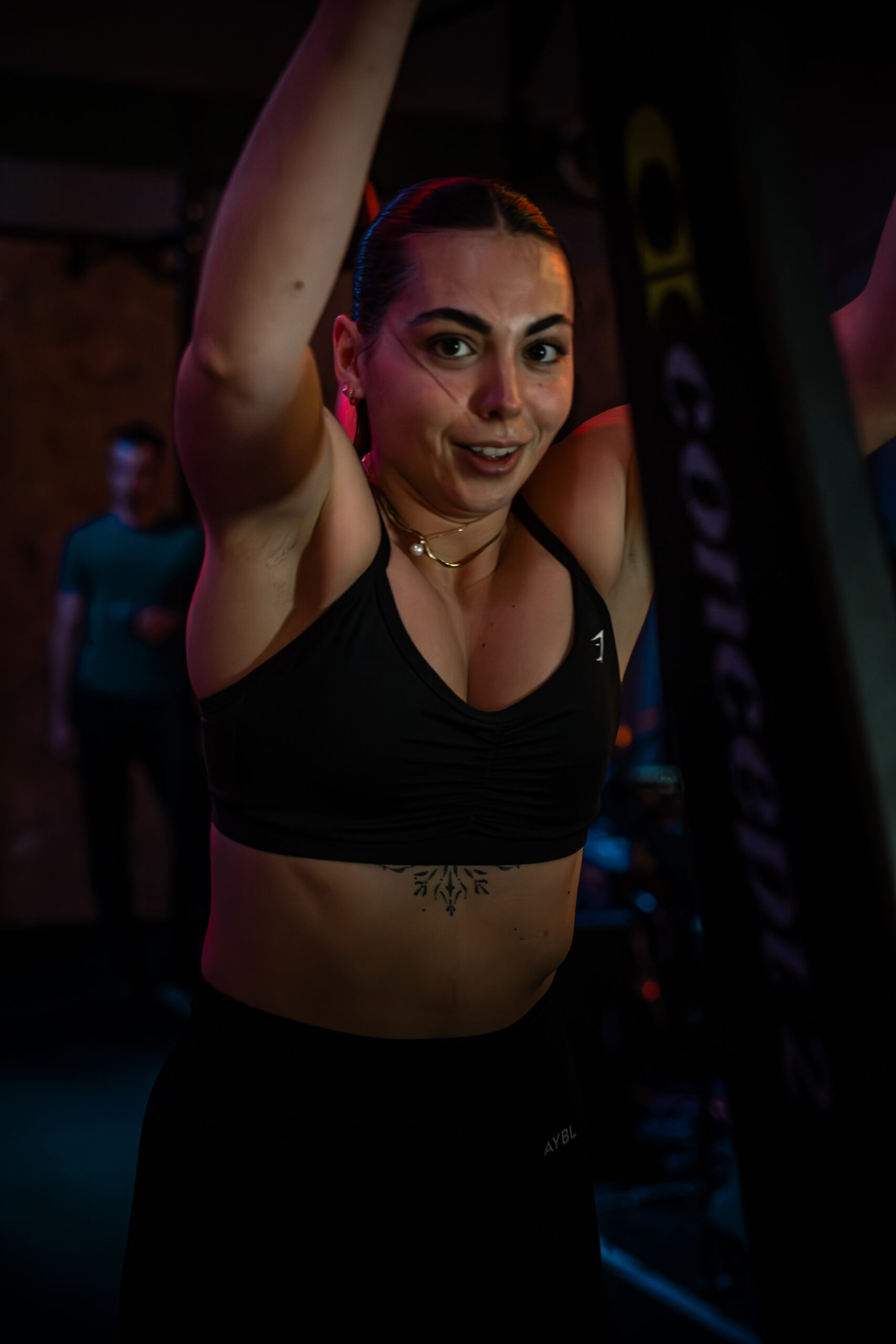 Une femme, vêtue d'un soutien-gorge de sport et d'un legging noirs, est photographiée en pleine action, levant un haltère au-dessus de sa tête avec son bras droit. Son expression est concentrée et on aperçoit de la sueur sur son front. La scène se déroule dans un lieu faiblement éclairé par des lumières colorées (tons violets et bleus), créant une ambiance dynamique, avec du matériel de scène (enceintes, micro) visible en arrière-plan.